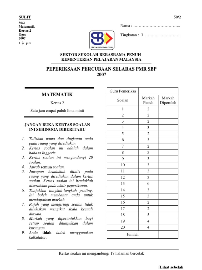 Pmr Percubaan 2007 Sbp Mathematics Paper 2 Daerah Lingkaran