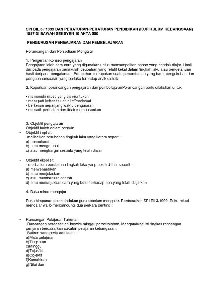 Spi Bil 3 1999 Dan Peraturan Peraturan Pendidikan Kurikulum Kebangsaan 1997 Di Bawah Seksyen 18 Akta 550 Pengurusan Pengajaran Dan Pembelajaran
