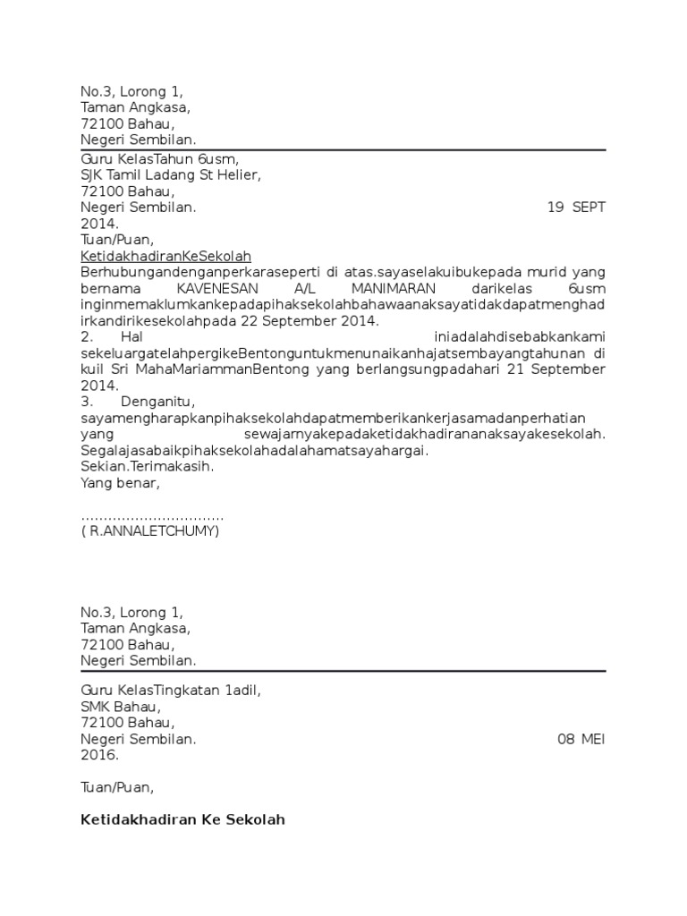 Contoh Surat Tidak Hadir Ke Sekolah Dengan Pelbagai Alasan Yang Munasabah Ohcewek