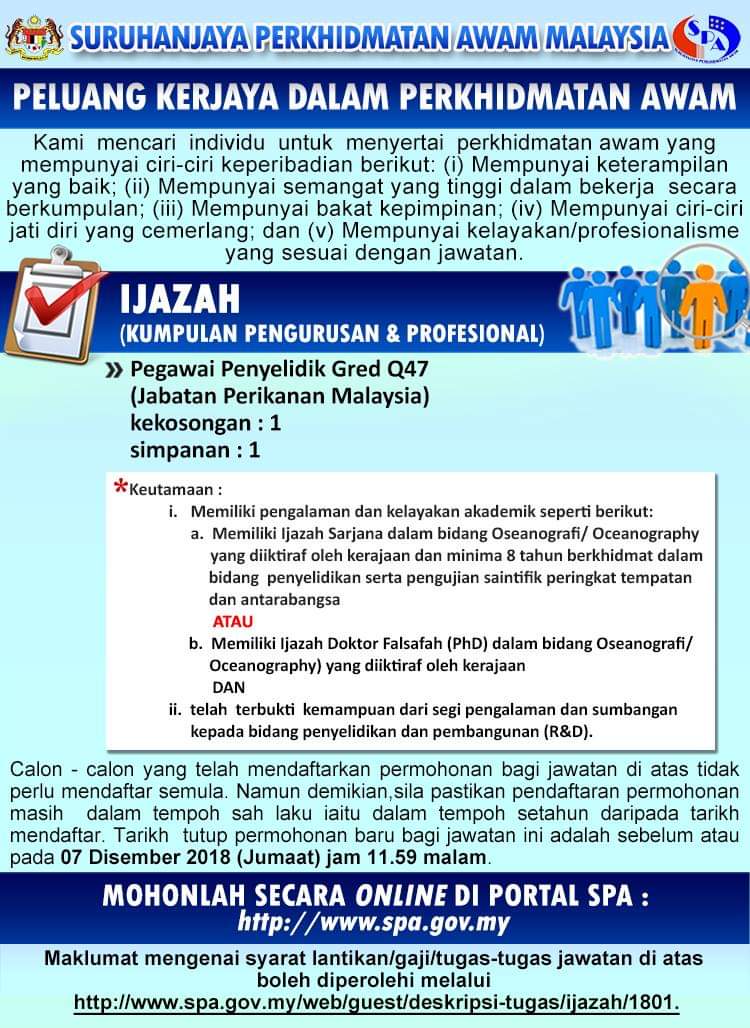 Spa Malaysia On Twitter Iklan Peluang Kerjaya Dalam Perkhidmatan Awam 1 Pegawai Penyelidik Gred Q47 Jabatan Perikanan Malaysia Kekosongan 1 Tarikh Tutup Permohonan 07 Disember 2018 Jumaat Jam