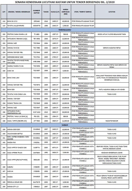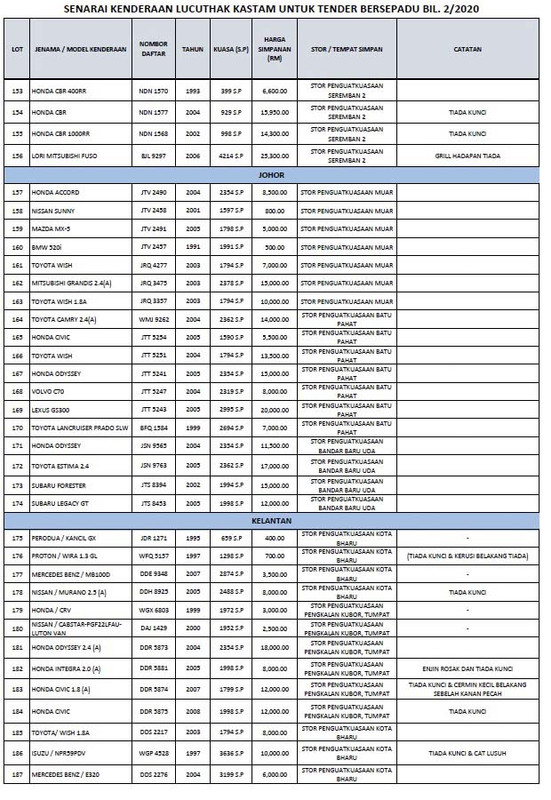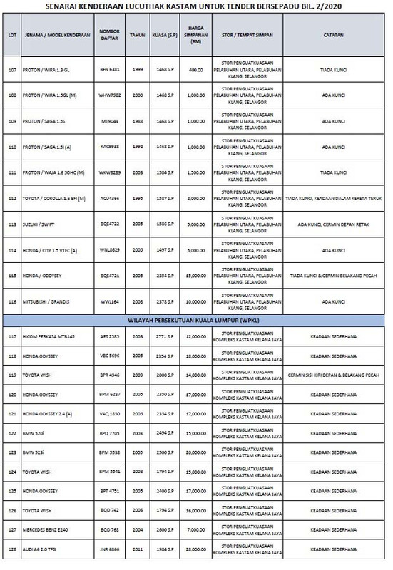 Show posts by this member only post 1. Di stor penguatkuasaan perlis kedah pulau pinang perak wpkl selangor klia pahang kelantan terengganu negeri sembilan melaka johor. Nov 06 2012 tender bersepadu kenderaan lucuthak kastam tender kenderaan lucuthak kastam baru saja dibuka kepada semua yangberminat untuk masuk tender untuk harga kereta motorsikal lori dan sebagainya.